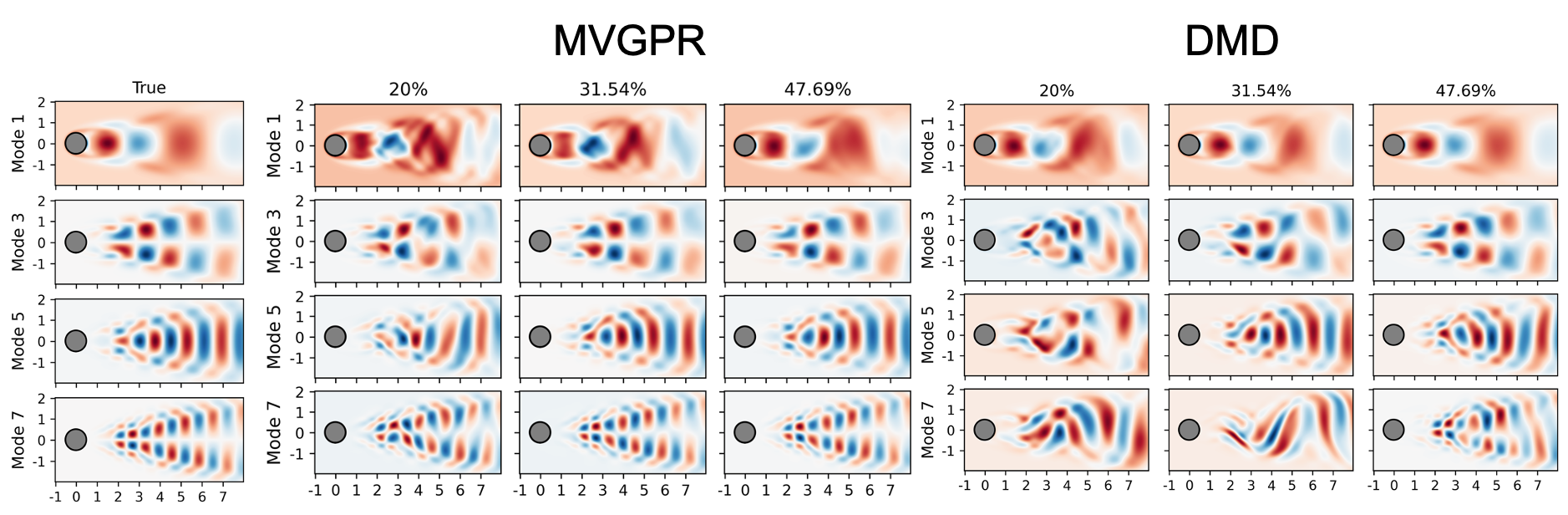 - We identified an interesting connection between Gaussian processes (GP) and the classical dynamical mode decomposition (DMD) method via linear system theory and Koopman formalism; in some sense, both methods estimate the spectral density of the underlying system.