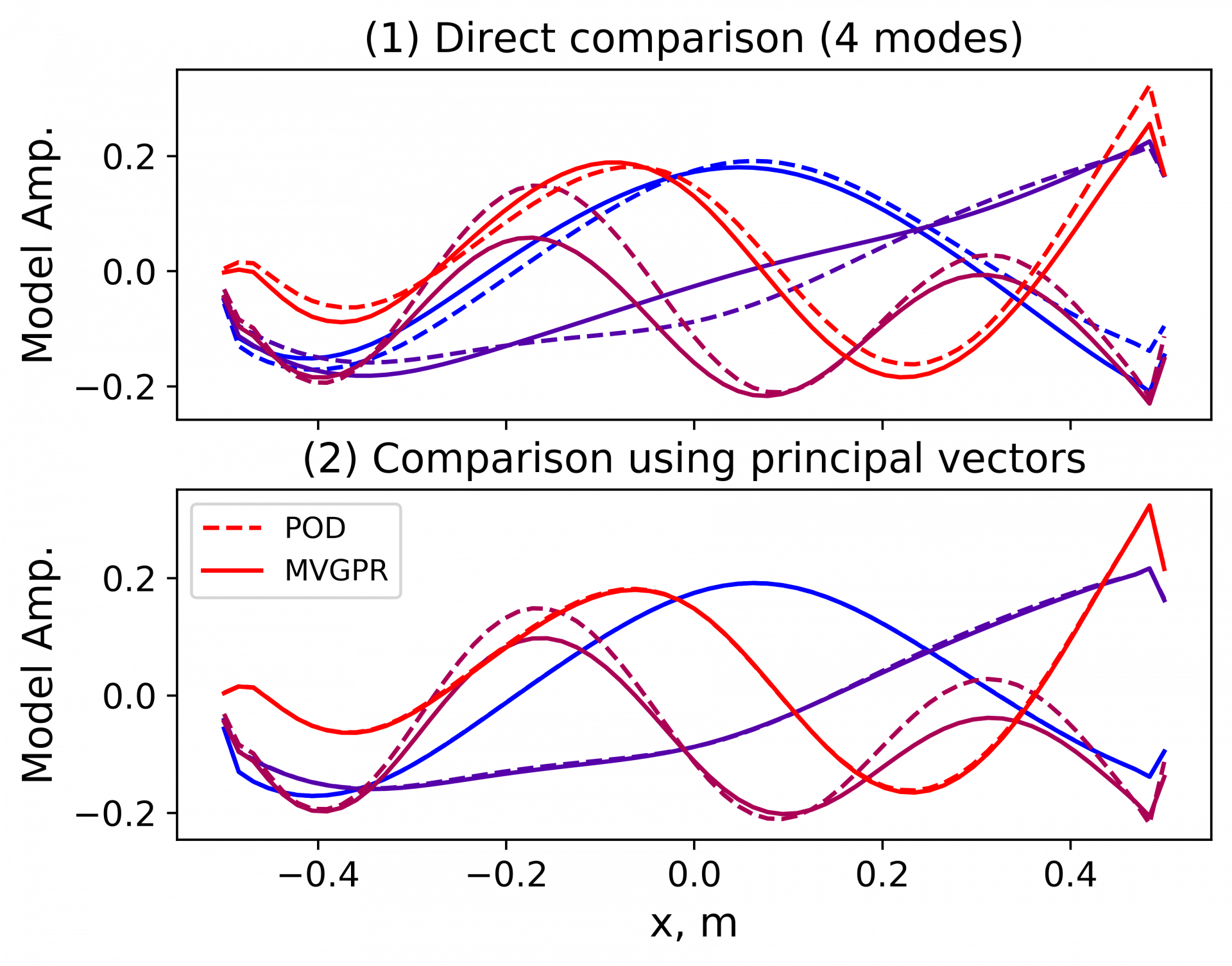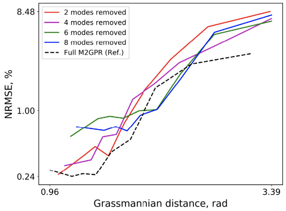 Furthermore, we revealed theoretically and numerically the connection between M2GPR and dimension reduction methods, such as PCA (Figure below left). Unlike conventional PCA methods, M2GPR reduces high-dimensional data points (i.e., outputs) while accounting for their low-dimensional “labels” (i.e., inputs); this better informs the model of the data space geometry and thus more accurate and efficient data compression.